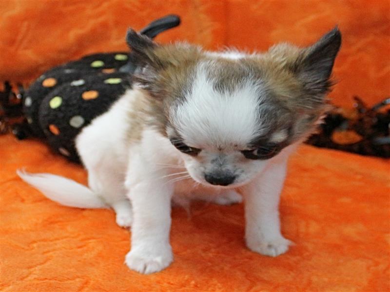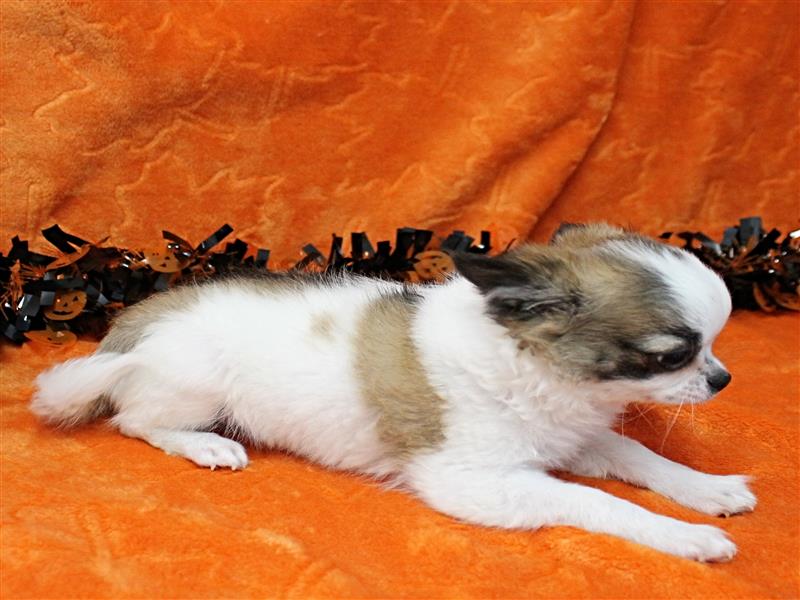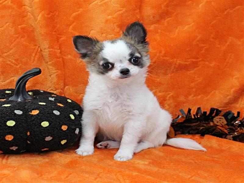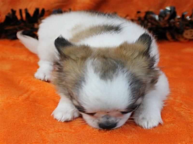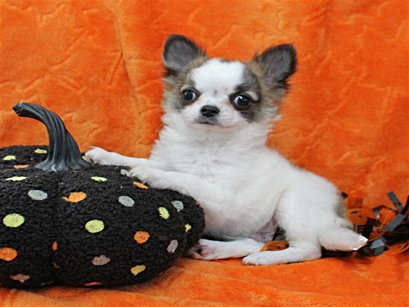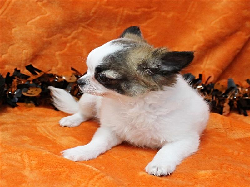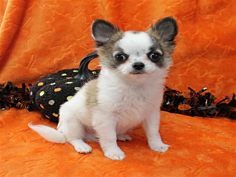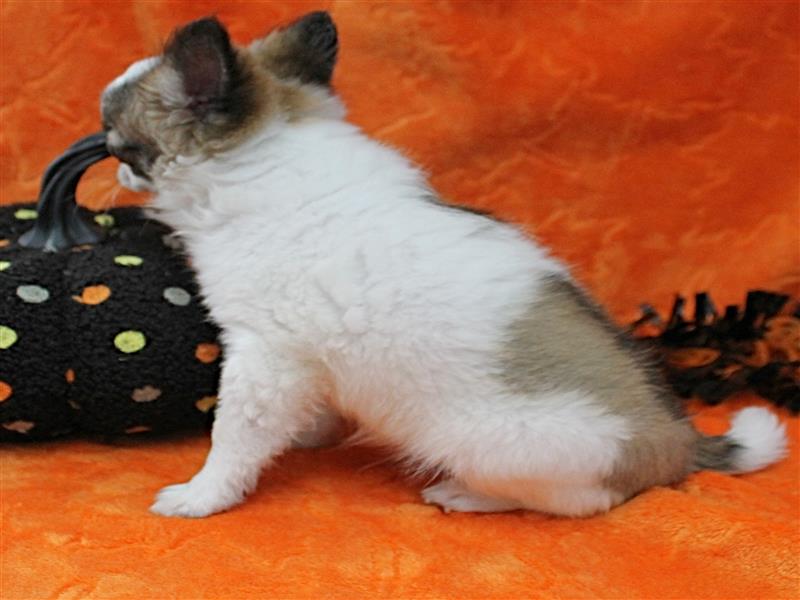 **Price** AKC Pet Only Registration: $1800 AKC Full registration is available for an additional charge. Please contact us for Full registration pricing. AKC Hela's White & Sable Spots Puppy 2. This puppy is a long hair. Born July 22nd. This little guy could be ready to leave for her new home around September 30th. Weights cannot be guaranteed, but she is currently charting to weigh between 3 to 3 1/2 lbs. A $200 nonrefundable deposit is required to hold the puppy for you. The puppy will come to you with current vaccinations, a medical record showing vaccinations and deworming's, registration application and a veterinarian check, as well as a 1-year health guarantee against congenital health issues. If feasible for you, we welcome you to visit our kennel and see the puppies. For our visitation guidelines, please visit our website at ricdenkennels.com under the About Us section.