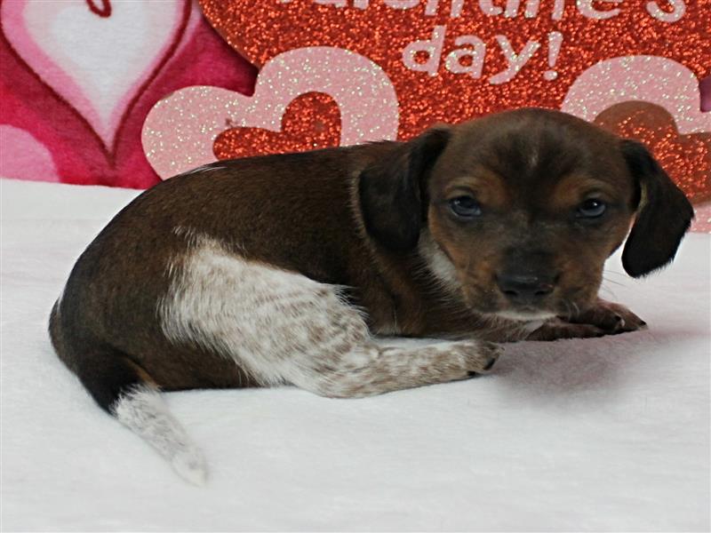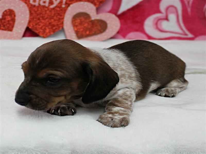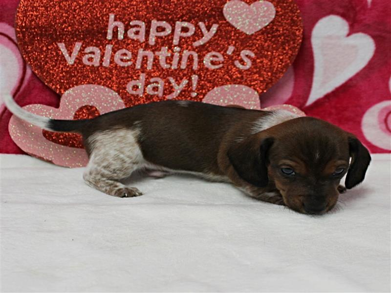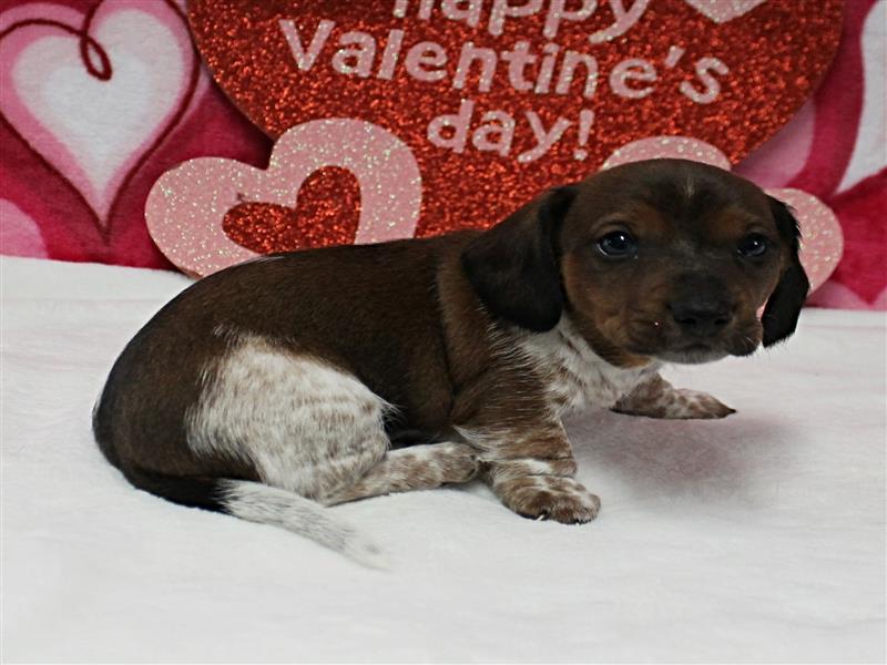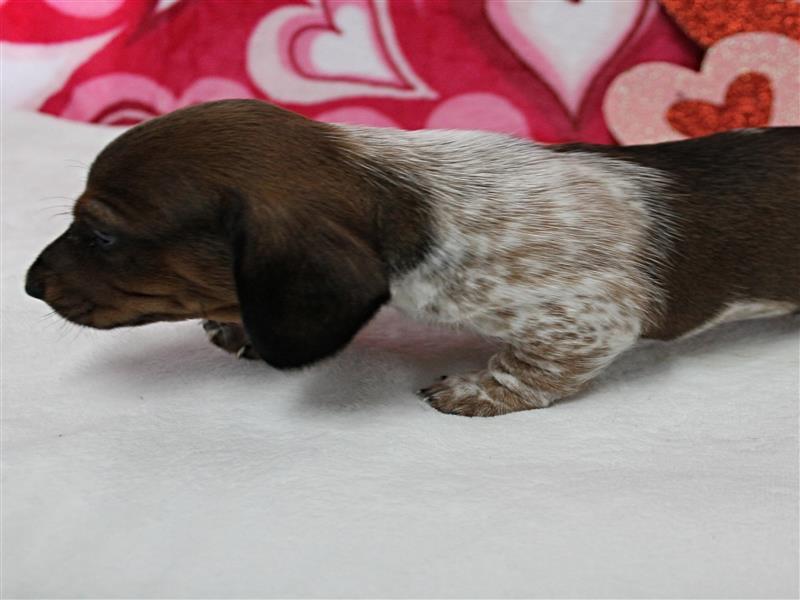 **Price** $1,800 AKC Maggie's Chocolate & White Piebald Male Puppy 3. Born December 24, 2025. This little guy could be ready to leave for his new home around February 18th. A $200 nonrefundable deposit is required to hold the puppy for you. The puppy will come to you with current vaccinations, a medical record showing vaccinations and deworming's, registration application and a veterinarian check. AKC Pet Only Registration: $1500 AKC Full registration is available for an additional charge. Please contact us for Full registration pricing. If feasible for you, we welcome you to visit our kennel and see the puppies. For our visitation guidelines, please visit our website at ricdenkennels.com under the About Us section.